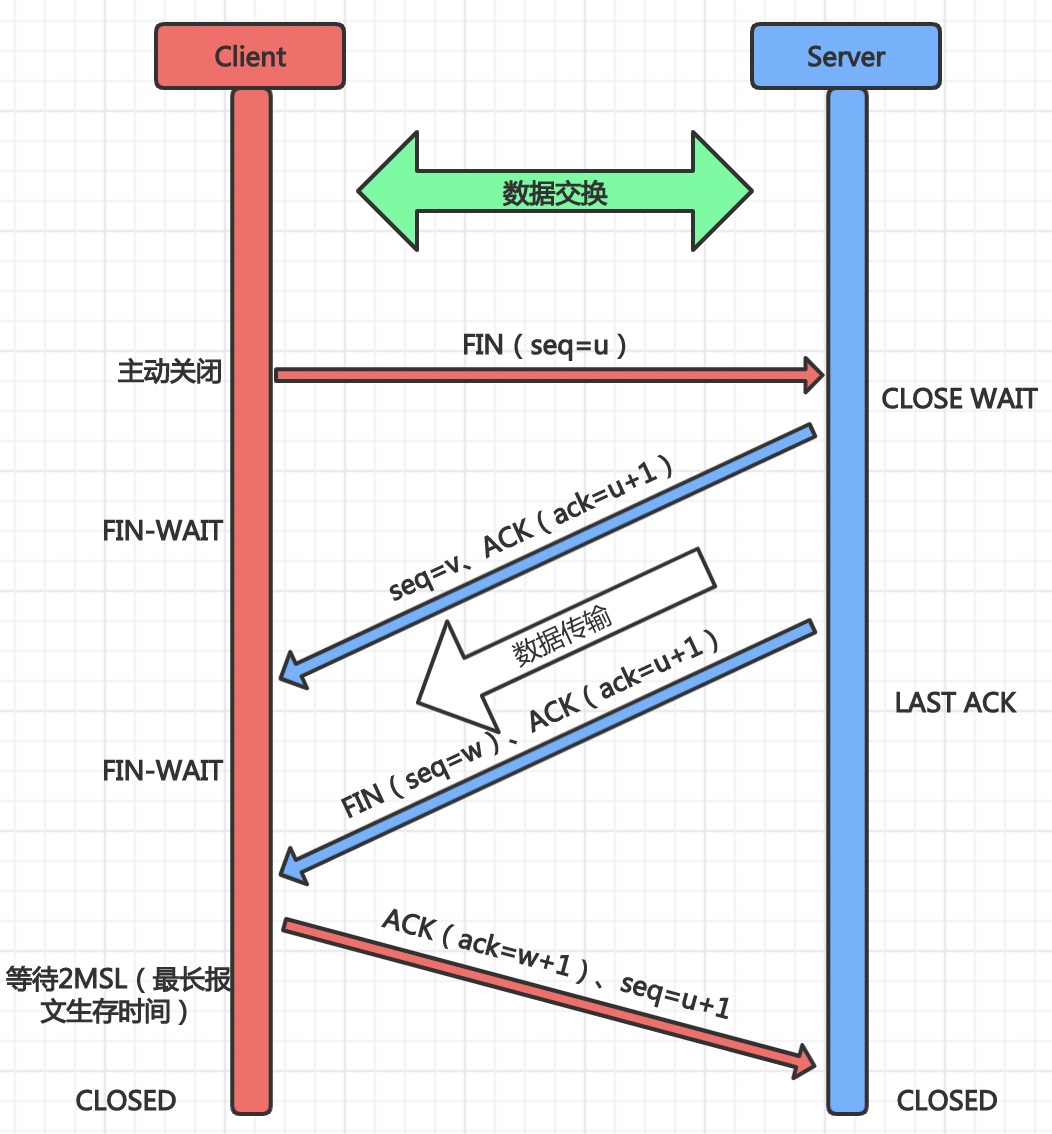 第四次挥手(最终释放确认)当C端收到了确认释放后,随即发送最终释放确认,ACK=1,ack=w+1,seq=u+1;此时C端在等待2MSL后关闭连接,S端收到请求后同样关闭。