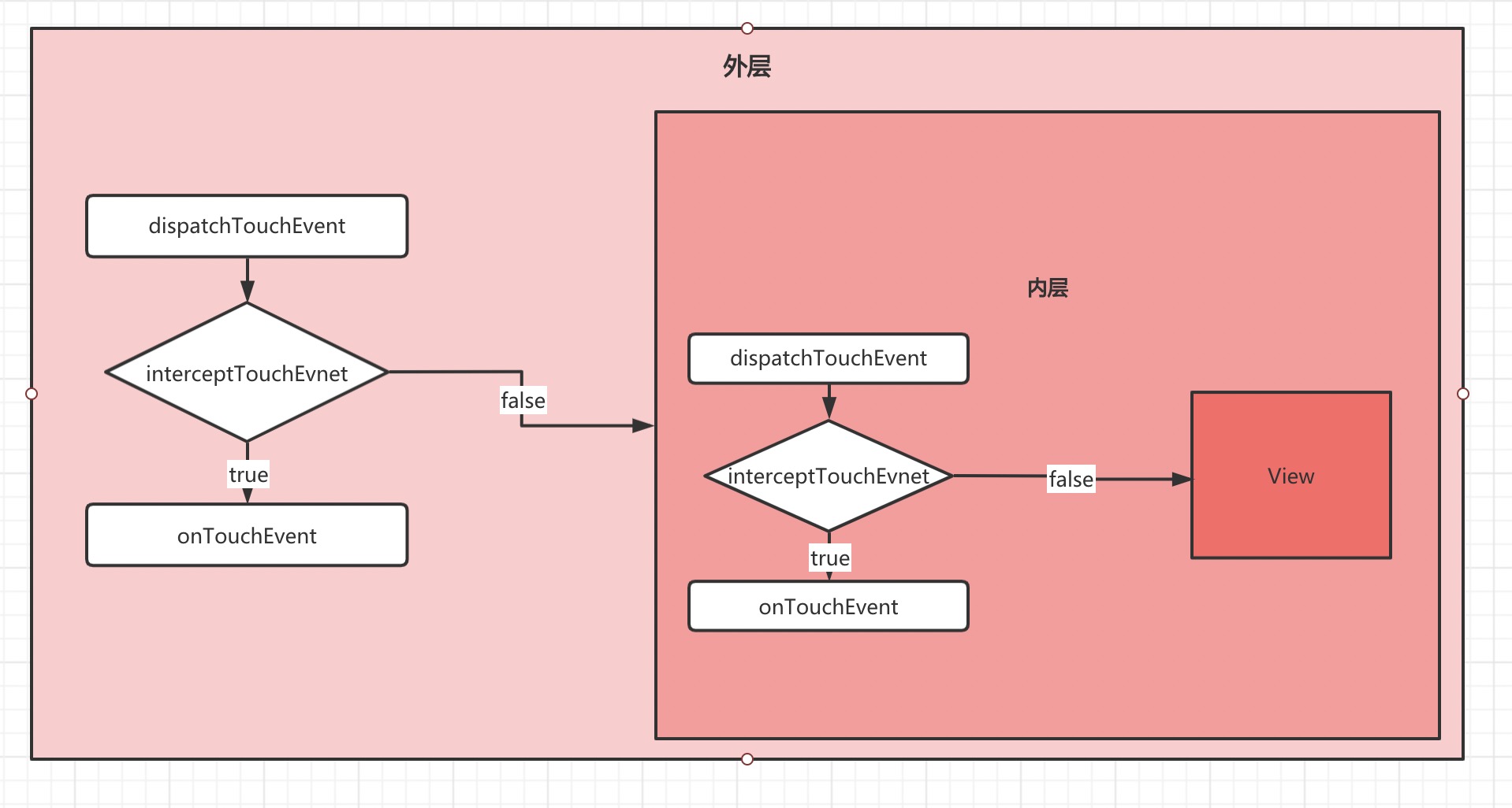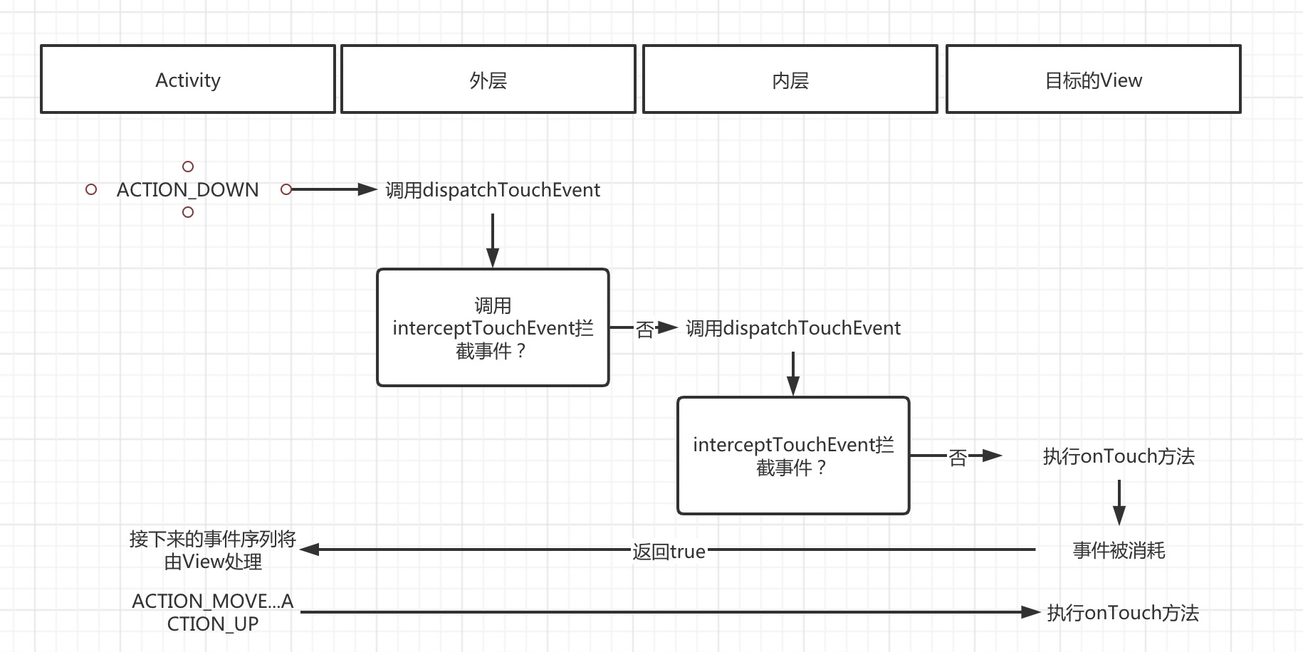 - 如果View再处理事件过程中,不再消耗ACTION_DOWN事件(onTouch返回false),那么事件序列的其他事件将会被其父元素进行消耗。